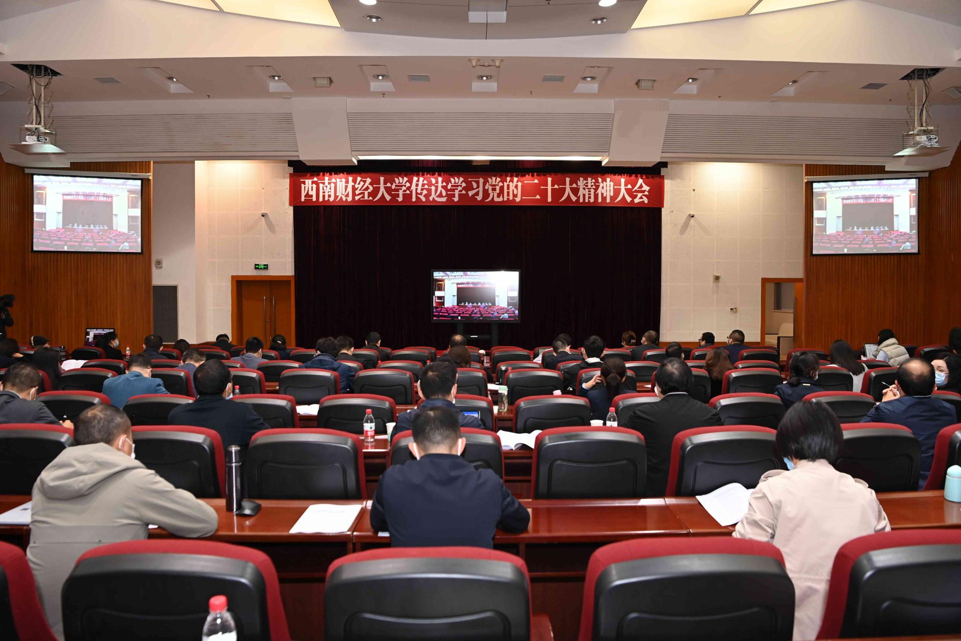 10月28日,學(xué)校召開傳達(dá)學(xué)習(xí)黨的二十大精神大會。黨委書記趙德武傳達(dá)黨的二十大精神,對學(xué)校學(xué)習(xí)宣傳貫徹黨的二十大精神工作作出全面安排部署,強(qiáng)調(diào)深入學(xué)習(xí)宣傳貫徹黨的二十大精神是當(dāng)前和今后一個時期全校的首要政治任務(wù),全校師生員工要深刻領(lǐng)悟“兩個確立”的決定性意義,切實增強(qiáng)“四個意識”、堅定“四個自信”、做到“兩個維護(hù)”,自覺把思想統(tǒng)一到黨的二十大精神上來,把力量凝聚到實現(xiàn)黨的二十大確定的各項任務(wù)上來,牢記空談?wù)`國、實干興邦,堅定信心、同心同德,踔厲奮發(fā)、勇毅前行,埋頭苦干,堅定推動黨的二十大決策部署在學(xué)校落地落實、見行見效,為辦好人民滿意的高等財經(jīng)教育、加快建設(shè)高等教育強(qiáng)國、譜寫全面建設(shè)社會主義現(xiàn)代化國家新篇章貢獻(xiàn)西財力量。