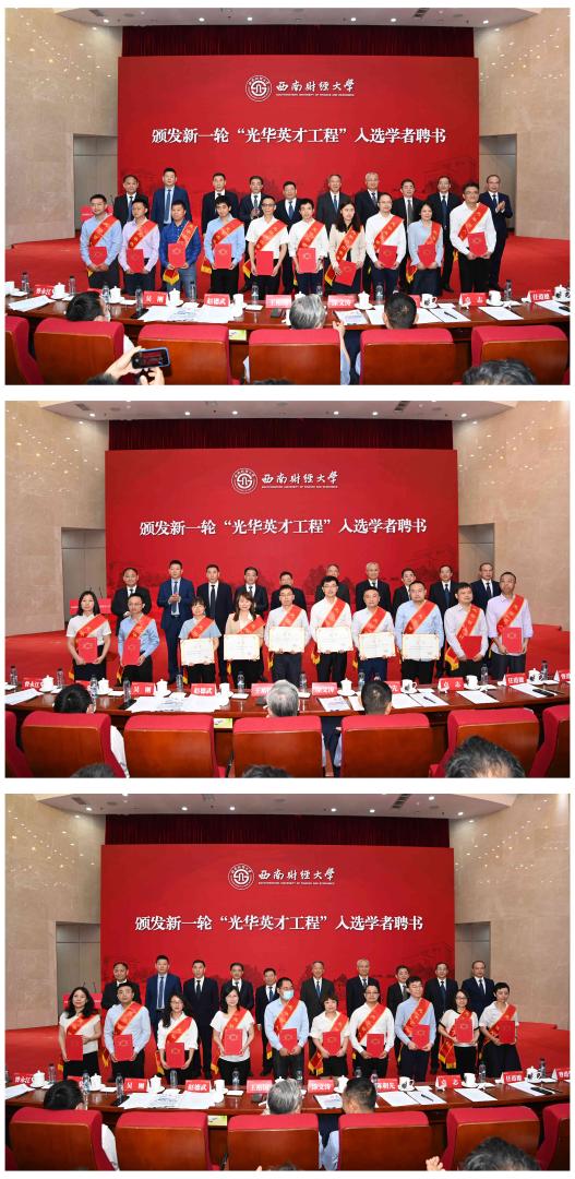 與會同志跟隨視頻短片回顧了學校建設國家及西部地區(qū)財經(jīng)人才高地的成績。校領導為新一輪“光華英才工程”入選的99名學者代表頒發(fā)聘書。