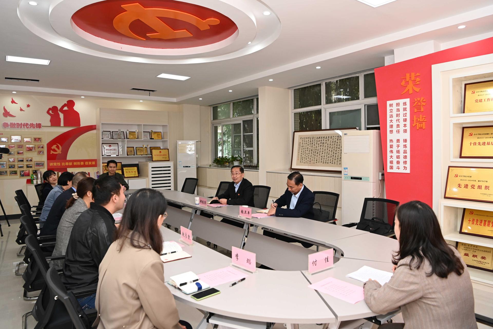 鄭德濤傳達了黨史學習教育中央巡回指導組座談會議精神、黨史學習教育中央領導小組《關于充分發揮基層黨組織戰斗堡壘作用和黨員先鋒模范作用進一步深化黨史學習教育“我為群眾辦實事”實踐活動的通知》《關于深入推進“我為群眾辦實事”實踐活動的通知》精神,對學校黨史學習教育成效給予充分肯定,并就進一步扎實開展黨史學習教育提出建議。他指出,黨史學習教育以來,西南財經大學黨委高度重視、分類指導、統籌推進,認真貫徹落實黨中央決策和教育部工作部署,深入推進黨史學習教育。學校高站位、嚴標準抓好學習習近平總書記“七一”重要講話精神及關于黨史學習教育的系列重要指示精神;深入宣傳闡釋,強化政治引領;用力用心用情開展“我為師生辦實事”實踐活動;注重發揮學科優勢,服務國家戰略和區域發展,開啟學?!笆奈濉苯ㄔO新征程。黨史學習教育階段性成效明顯。建議西南財經大學在前期工作基礎上,以更高標準、更嚴要求、更實舉措,把黨史學習教育引向深入,并就進一步聚焦學懂弄通做實習近平新時代中國特色社會主義思想、抓好“我為師生辦實事”實踐活動、推動黨史學習教育與做好學校中心工作緊密結合以及抓好責任落實提出了具體工作建議。