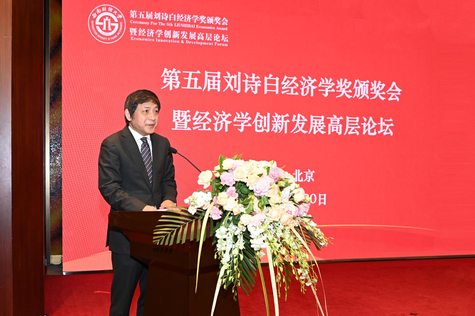 5月30日上午,第五屆劉詩白經濟學獎頒獎會暨經濟學創新發展高層論壇在北京隆重舉行。教育部原黨組成員、教育部社科委副主任、北京大學顧海良教授,南京大學原黨委書記、教育部社科委副主任洪銀興教授,中國人民大學校長劉偉教授,南開大學原副校長逄錦聚教授,民革中央副主席、全國政協副秘書長劉家強,中國證監會原副主席、全國人大財經委員會副主任劉新華,北京師范大學經濟與資源管理研究院名譽院長李曉西教授,中國投資有限責任公司原副總經理謝平教授,中央民族大學原校長黃泰巖教授,北京外國語大學校長楊丹教授,北京大學校長助理、經濟學院院長董志勇教授,中國人民大學楊瑞龍教授,廈門大學莊宗明教授,武漢大學簡新華教授,遼寧大學林木西教授,南京大學范從來教授,西安財經大學副校長任保平教授;我校校長卓志教授,中國金融研究中心名譽主任劉錫良教授,校學術委員會主任劉燦教授,北京校友會會長任道德,上海校友會會長朱勝良,校友、國家開發銀行石紀揚,校友、百度高級副總裁劉輝等80人出席頒獎會。黨委常委、常務副校長彭龍教授主持會議。