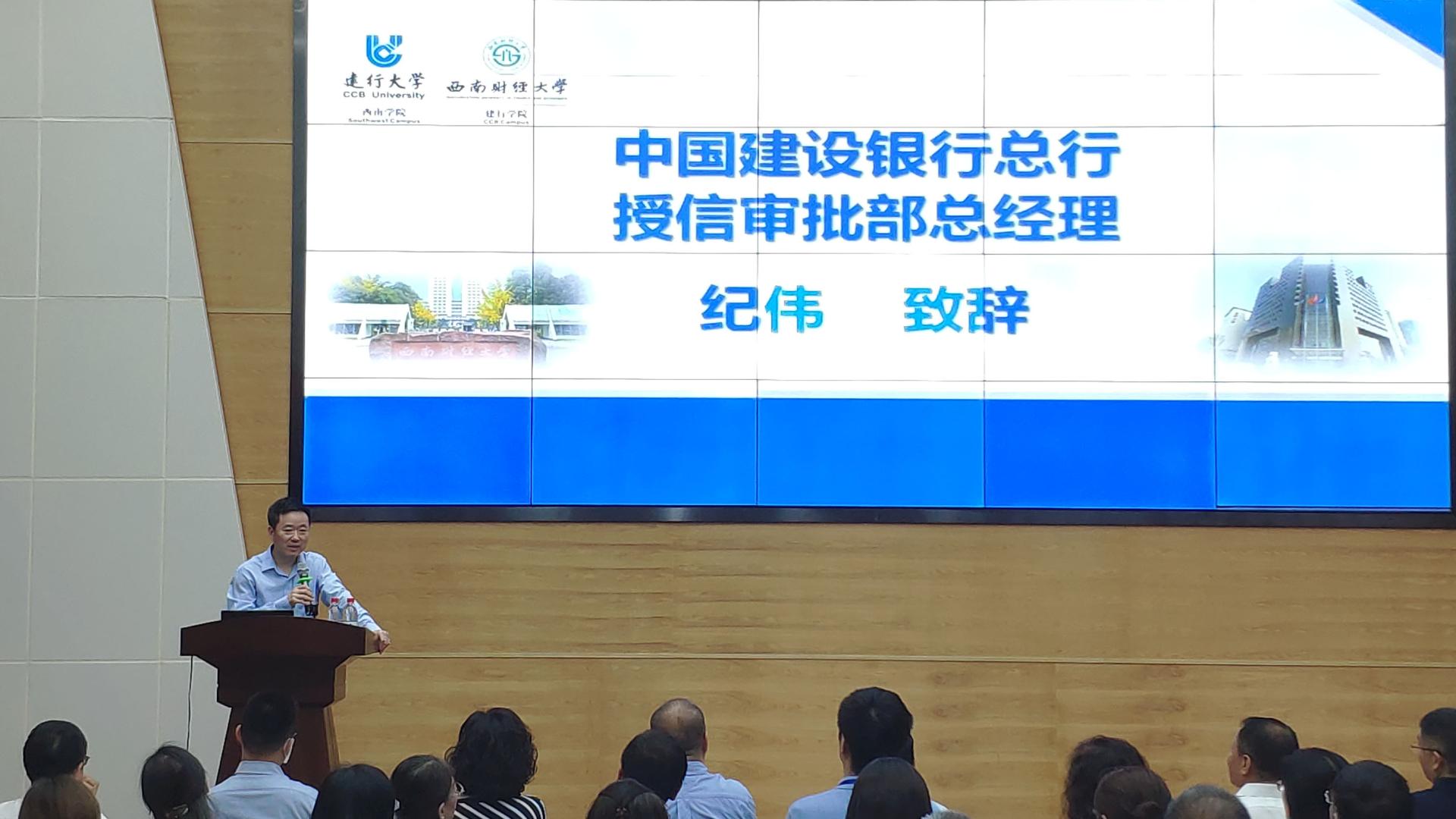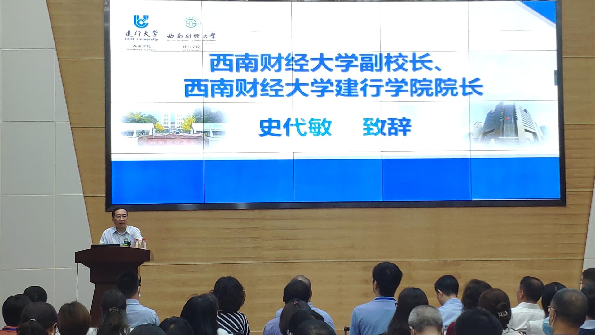 6月7日,建行大學第一期審批人能力提升(財務與金融)專題培訓班開班典禮在建行學院演播廳舉行。我校副校長、西財建行學院院長史代敏和中國建設銀行總行授信審批部總經理紀偉出席開班儀式并致辭。來自建設銀行總行、建行大學西南學院、建設銀行四川省分行的負責人參加了開班儀式。
