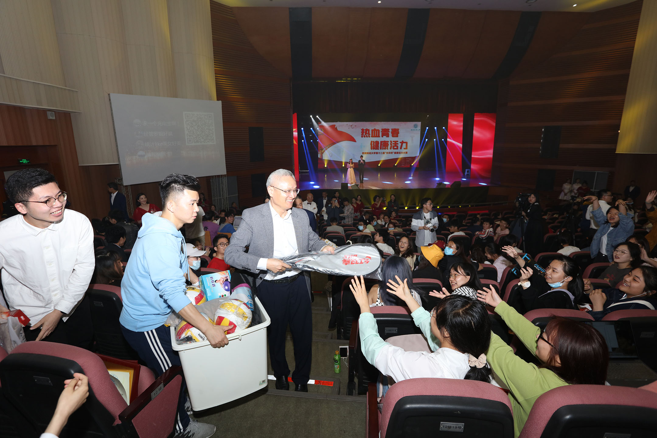 晚會(huì)為大家呈現(xiàn)了一臺(tái)健康活力的視聽盛宴,學(xué)校領(lǐng)導(dǎo)、職能部門及學(xué)院(中心)負(fù)責(zé)人為獲獎(jiǎng)單位和個(gè)人頒獎(jiǎng),校領(lǐng)導(dǎo)還走向觀眾席與師生互動(dòng),送出大量健身器材,鼓勵(lì)正當(dāng)青春的同學(xué)們積極參加體育鍛煉,在運(yùn)動(dòng)中燃燒激情、在陽(yáng)光下綻放青春。