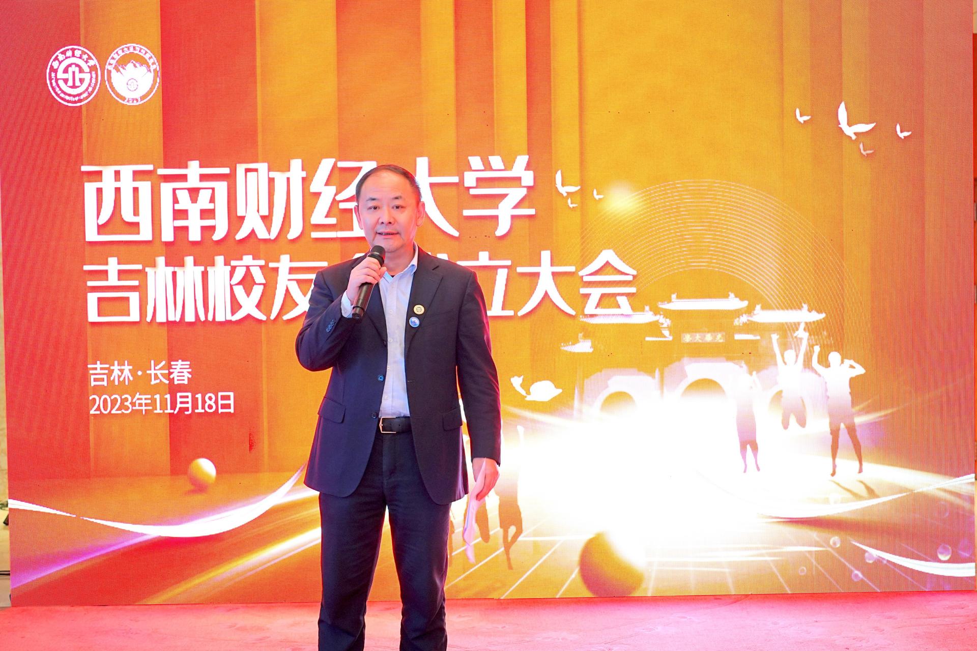 張邦富受學校黨委書記趙德武,黨委副書記、校長李永強的委托,代表全校師生向與會校友致以親切問候,向吉林校友會的成立表示熱烈祝賀。他對扎根吉林、服務吉林,為推動吉林全面振興全方位振興不懈貢獻西財力量的廣大校友給予了高度評價,希望廣大校友始終秉承“經世濟民、孜孜以求”的西財精神,以昂揚斗志、務實作風取得新的成績、做出新的貢獻。張邦富向廣大校友介紹了學校近年來改革發展情況和“雙一流”建設取得的重要成果,并對吉林校友會充分發揮紐帶作用,團結廣大在吉校友積極參與學校“新財經”戰略升級、百年校慶籌備、建設財經特色鮮明的世界一流大學的各項重要工作表示了高度期許。