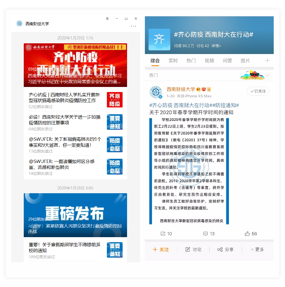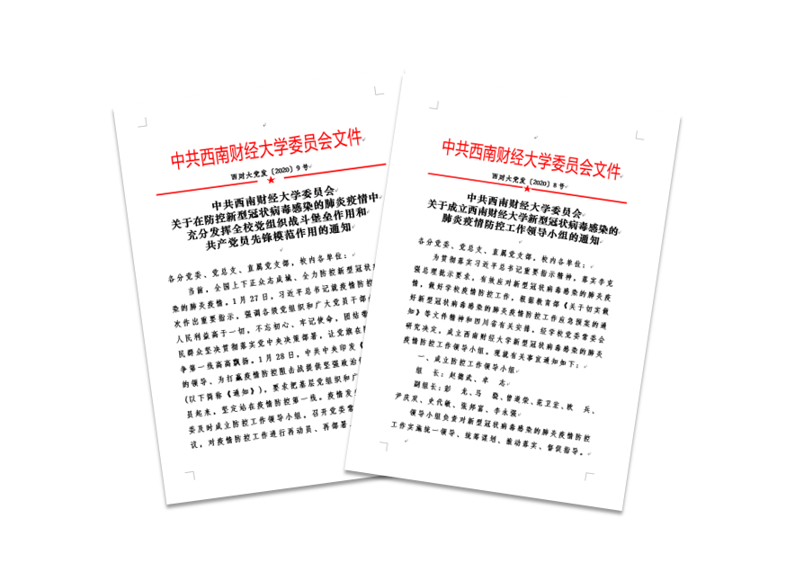 學(xué)校疫情防控工作領(lǐng)導(dǎo)小組多次召開專題會(huì)議,校領(lǐng)導(dǎo)多次到一線檢查工作,慰問工作人員。學(xué)校先后下發(fā)《關(guān)于在防控新型冠狀病毒感染的肺炎疫情中充分發(fā)揮全校黨組織戰(zhàn)斗堡壘作用和共產(chǎn)黨員先鋒模范作用的通知》《新型冠狀病毒感染肺炎預(yù)防措施》《關(guān)于進(jìn)一步做好新型冠狀病毒感染的肺炎疫情防控工作的通知》《關(guān)于進(jìn)一步加強(qiáng)疫情防控的注意事項(xiàng)》《關(guān)于進(jìn)一步加強(qiáng)校園管控的通知》《關(guān)于2020年春季學(xué)期開學(xué)時(shí)間的通知》《關(guān)于寒假期間學(xué)生不得提前返校的通知》《致全體西財(cái)校友的慰問信》等一系列通知。