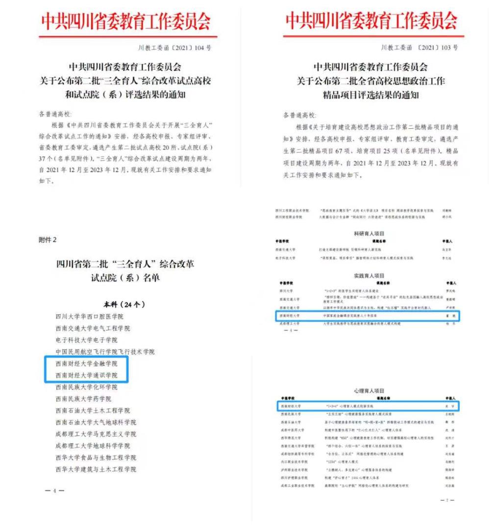 新聞事件:1月,我校入選“全省黨建工作示范高校”培育單位,入選全省黨建工作“標桿院系”2個、“樣板支部”2個、全省“‘雙帶頭人’教師黨支部書記工作室”3個。6月,我校《財政學》等4門課程入圍教育部國家級首批課程思政示范項目。12月,馬克思主義學院“全國高校思政課虛擬仿真體驗教學中心”獲準教育部社科司2020-2022年高校思想政治理論課建設項目立項,是全國正式獲批的兩家之一。12月,金融學院、人文(通識)學院入選四川省第二批“三全育人”綜合改革試點院(系),“‘1+3+4’心理育人模式創新實踐”和“中國家庭金融調查育人實踐十年探索”兩個育人項目獲評四川省第二批高校思想政治工作精品項目。