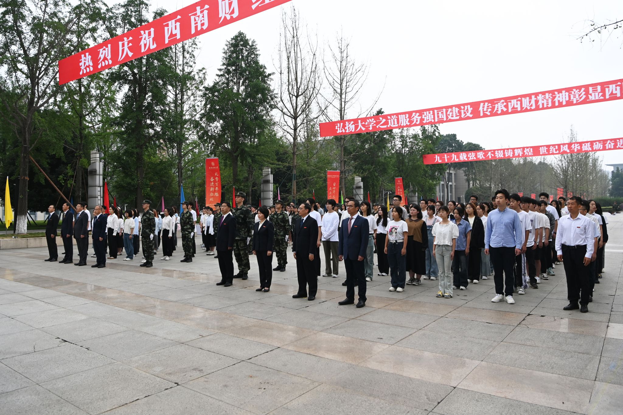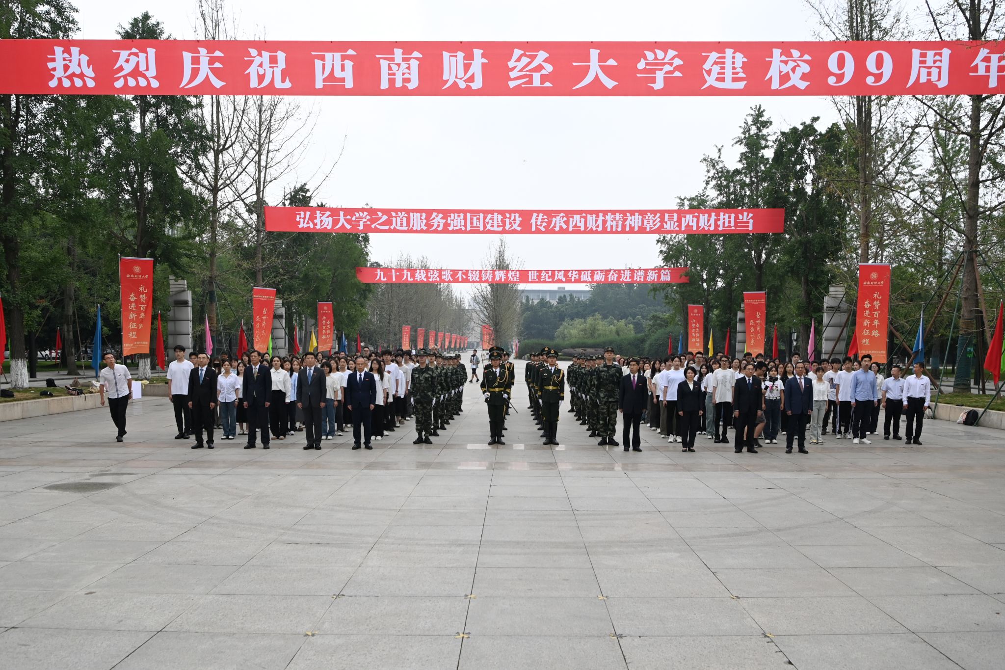 校領(lǐng)導(dǎo)發(fā)表熱情洋溢的講話。他們深情回顧了學(xué)校99年來從黃浦江畔到浣花溪邊,始終與國家共命運(yùn),始終堅(jiān)持黨的全面領(lǐng)導(dǎo),風(fēng)雨兼程繪就團(tuán)結(jié)奮斗、搶抓機(jī)遇、創(chuàng)新發(fā)展、追求卓越壯麗畫卷的崢嶸歷程。他們指出,明年此刻學(xué)校將迎來建校100周年。獻(xiàn)禮百年西財(cái),要不忘立德樹人初心,牢記為黨育人、為國育才使命,努力培養(yǎng)更多讓黨放心、愛國奉獻(xiàn)、擔(dān)當(dāng)民族復(fù)興重任的時(shí)代新人。要以更大擔(dān)當(dāng)服務(wù)國家戰(zhàn)略需求,堅(jiān)持教育、科技、人才一體推進(jìn),不斷增強(qiáng)辦好人民滿意高等財(cái)經(jīng)教育的責(zé)任感、使命感、緊迫感。要全面推進(jìn)學(xué)校“新財(cái)經(jīng)”戰(zhàn)略升級,在進(jìn)一步全面深化改革中推動高質(zhì)量發(fā)展,加快建設(shè)財(cái)經(jīng)特色鮮明的世界一流大學(xué),為以中國式現(xiàn)代化全面推進(jìn)強(qiáng)國建設(shè)、民族復(fù)興偉業(yè)作出新的更大貢獻(xiàn)。