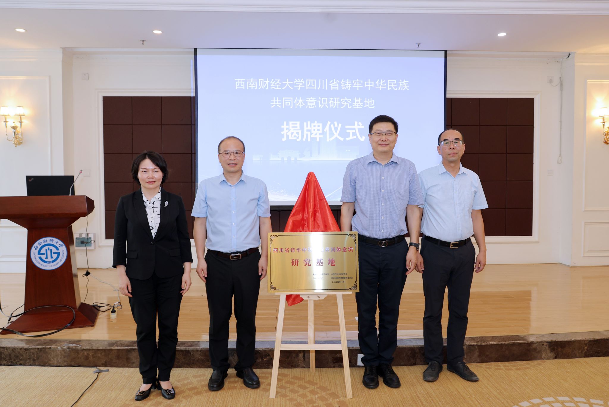 學(xué)校研究基地首席專家邊慧敏教授介紹了研究基地建設(shè)方案。劉向鴻、張靖、李永強(qiáng)、謝紅共同為西南財(cái)經(jīng)大學(xué)四川省鑄牢中華民族共同體意識(shí)研究基地揭牌。謝紅、邊慧敏頒發(fā)研究基地學(xué)術(shù)委員會(huì)專家聘書。邊慧敏和基地主任鄧湘樹(shù)向研究基地首批工作站授牌。